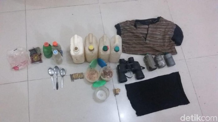 "3 buah bom lontong, 1 buah teropong siang, 3 buah sendok makan, 3 toples plastik kecil berisikan 9 biji buah kurma dicampur kue, 2 amunisi aktif kaliber 5,56, 7 selongsong amunisi kaliber 5,56," kata Karo Penmas Divisi Humas Polri Brigjen Dedi Prasetyo dalam keterangan tertulis, Selasa (1/1/2019).