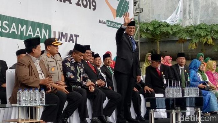 Upacara dilaksanakan di halaman kantor Kementerian Agama kota Jakarta Timur, Jalan Terusan I Gusti Ngurah Rai, Pondok Kopi, Jakarta Timur, Kamis (3/1/2019). Dalam sambutannya, Anies berterima kasih atas jasa guru agama dalam memberikan pemahaman agama kepada warga.