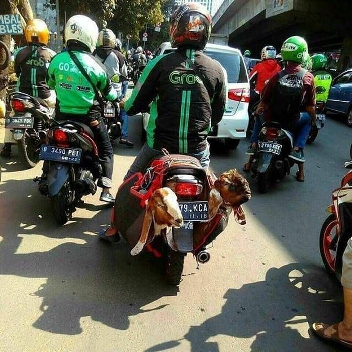 Selain pelanggan berkostum unik, ada foto mitra pengemudi Grab yang menerima pesanan untuk mengantar makhluk ajaib lainnya melalui GrabExpress. Ya, tersebar foto dua ekor kambing ikut menumpang Grab untuk diantar ke tujuan.