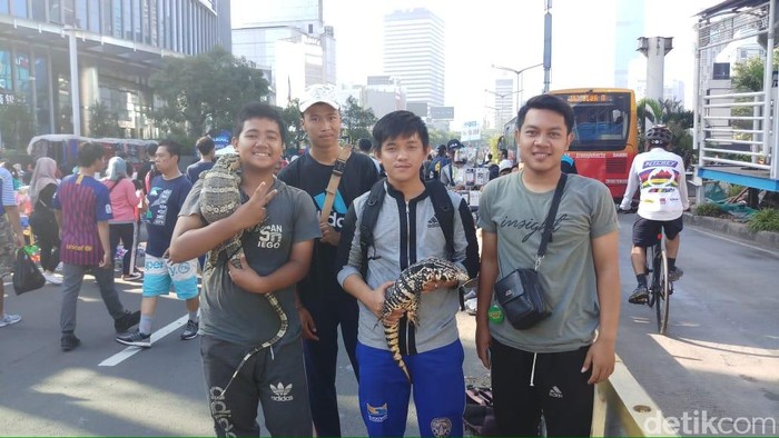 Sekelompok orang itu adalah anggota Komunitas Raja--singkatan dari Reptil dan Mamalia Anak Jakarta. Mereka sedang memamerkan peliharaannya di Jalan Jenderal Sudirman, Minggu (6/1/2019). Orang-orang tampak memperhatikan kadal-kadal yang mereka sampirkan di pundak.