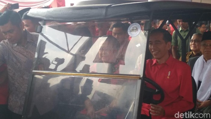 Pantauan di JIExpo Kemayoran, Jakarta Pusat, Kamis (10/1/2019), Jokowi tiba sekitar pukul 10.25 WIB dengan mengendarai mobil golf. Mengenakan kemeja merah, Jokowi memegang kemudi.