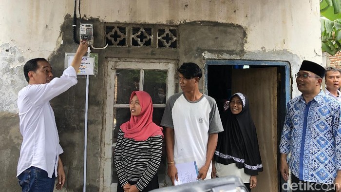 Jokowi bertemu dengan pemilik rumah, menyerahkan sertifikat penyambungan listrik gratis oleh pemerintah. Dia juga menyalakan langsung meteran listrik di rumah yang dia sambangi.