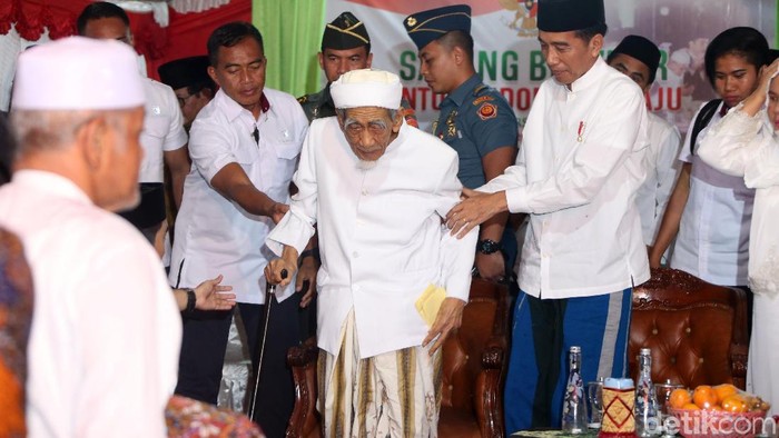 "Jadi dengan ini saya pribadi, siapa yang ada di samping saya nggak ada kecuali Pak Jokowi," lanjut Mbah Moen. Jokowi lalu terlihat mengangguk.