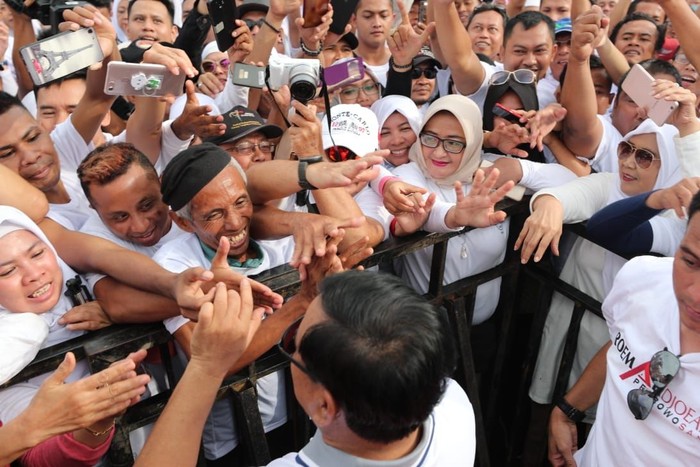 "Kalau saya lempar, takut robek-robek. Ternyata emak-emak ini luar biasa keras tangannya. Kalau dikasih tangan nggak mau dilepas, ini karena gemes atau apa?" kata Prabowo disambut derai tawa emak-emak.