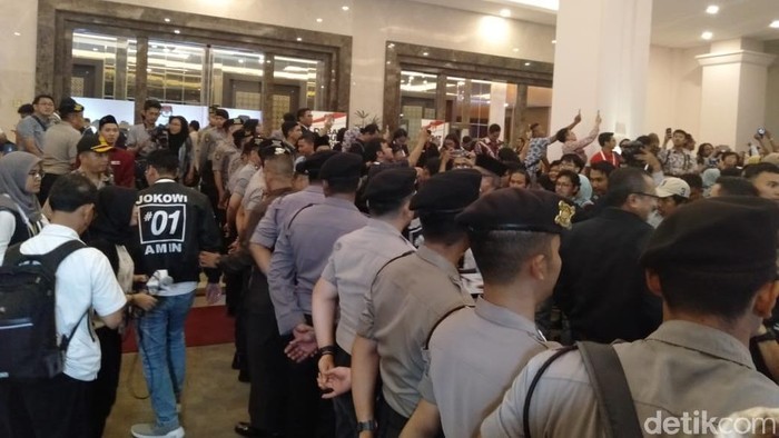 Polisi yang berada di lokasi berinisiatif memisahkan kedua kelompok pendukung di dekat pintu masuk The Sultan Hotel. Tampak 20 polisi membuat 'pagar betis'.