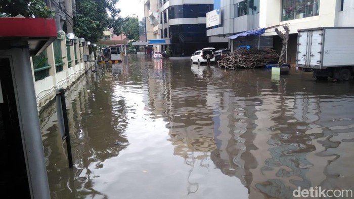Pantauan detikcom di Jalan Mangga Dua, Jakarta Utara, pukul 16.41 WIB, Rabu (6/3/2019), tampak halaman ruko tergenang air. Ketinggian air sekitar 20 cm.