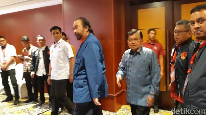 JK yang merupakan Ketua Dewan Pengarah TKN Jokowi-Ma'ruf datang mengenakan batik berwarna biru. Saat masuk ke ruangan, dia didampingi Sekjen PDIP Hasto Kristiyanto dan Ketua Umum NasDem Surya Paloh.