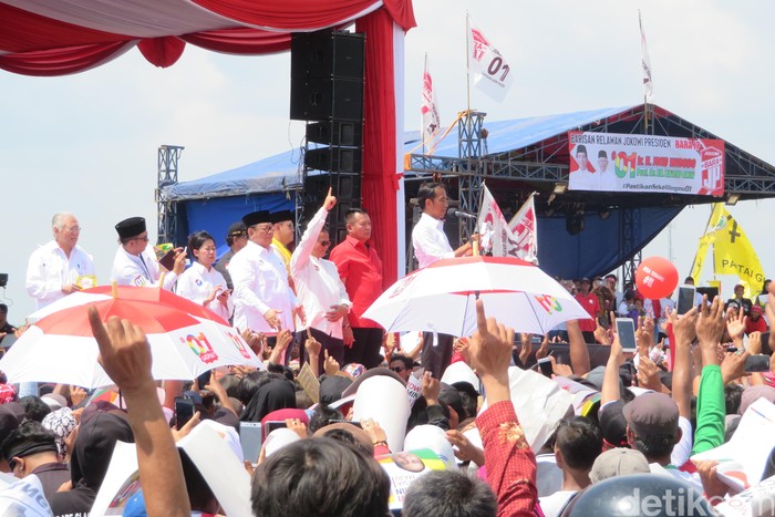 Jokowi bersama istri, Iriana, menyapa pendukung yang berkumpul lapangan dekat Pelabuhan Perikanan Gebangmekar, Cirebon Jawa Barat. Hadir juga dalam kampanye tersebut di antaranya Ketua TKN Jokowi-Ma'ruf Erick Thohir, Ketum PDIP Megawati Soekarno Putri, hingga Gubernur Jawa Barat Ridwan Kamil.