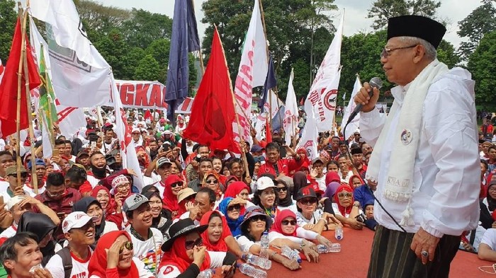 Di panggung kampanye, Ma'ruf, yang mengenakan hoodie warna putih, mengajak peserta kampanye menyanyikan lagu 'Jokowi Presiden Kita'. (fdn/fdn)