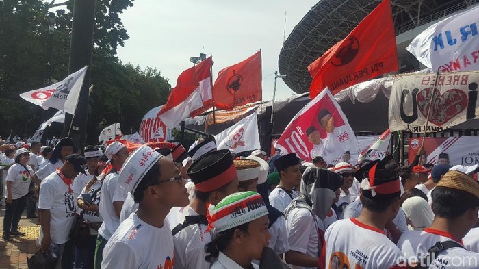 Pantauan detikcom di pintu 10 Gelora Bung Karno, Senayan, Jakarta Selatan, Sabtu (13/4/2019), masaa yang dominan memakai kaus putih bergambar wajag Jokowi-Ma'ruf tampak padat. Mereka berjajar panjang untuk masuk ke stadion utama GBK.