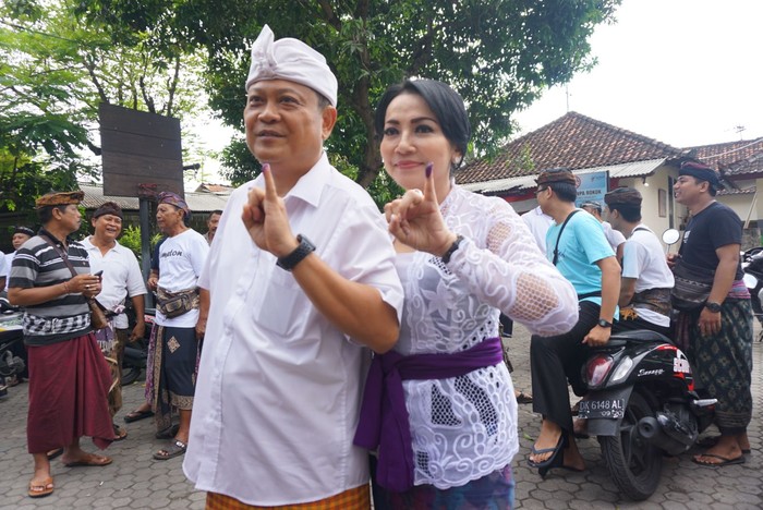 Pantauan detikcom, Rai Mantra terlihat datang ke TPS 15 di Sumerta Selatan, Banjar Bengkel, Denpasar, Bali, Rabu (17/4/2019) bersama istrinya Selly Mantra dan ibunya sekitar pukul 09.00 Wita. Ketiganya memakai busana adat dengan dominan warna putih.