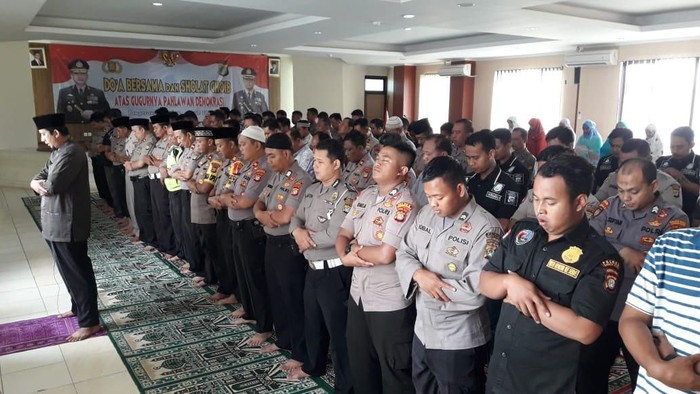 Ratusan personel Polres Tangsel menggelar salat gaib dan doa bersama untuk mendoakan para petugas yang meninggal. Salat gaib digelar di Aula Lantai 4 Polres Tangsel pada pukul 08.00 WIB, Jumat (25/4).