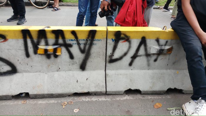 Dari pantauan, Rabu (1/5/2019), posisi separator busway itu berada di bawah Jembatan Penyeberangan Orang (JPO) di depan Kementerian Pariwisata (Kemenpar). Tampak coretan dari cat semprot warna hitam 'Rakyat Anti Kapitalis, May Day, Rezim Fasis' terpampang pada separator busway itu.