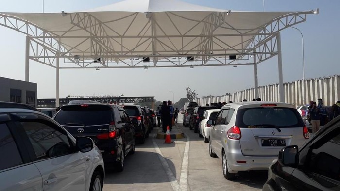Terlihat sejumlah petugas tol sebagai mobile rider bersiaga di gerbang tol. Petugas kepolisian juga berjaga di sekitar gerbang tol.