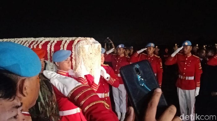 Setelah itu, peti jenazah dimasukkan ke dalam mobil ambulans. Mobil melaju menuju Cikeas pukul 22.30 WIB.