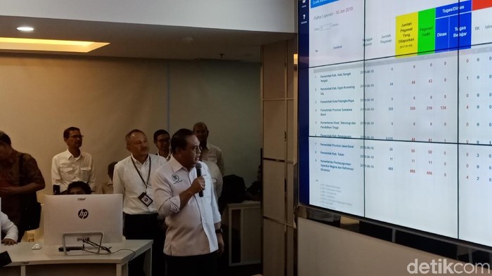 Pemantauan dilakukan Syafruddin di ruang Command Centre Kementerian PAN-RB, Jl Jenderal Sudirman, Senin (10/6/2019) pukul 10.10 WIB. Hadir seluruh pejabat tinggi Kementerian PAN-RB.