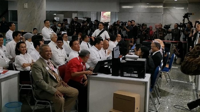 Setibanya, Yusril dan rombongan langsung menuju meja panitera. Mereka menyerahkan bukti-bukti guna menjawab gugatan tim hukum Prabowo Subianto-Sandiaga Uno.