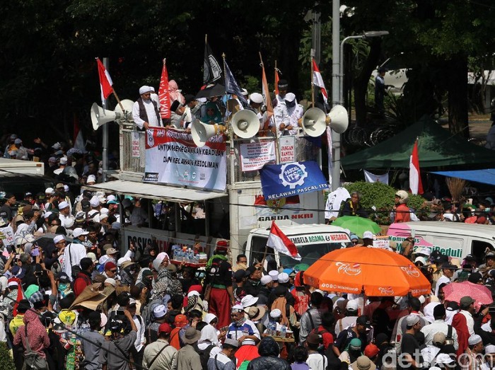 Jakarta - Massa aksi kawal Mahkamah Konstitusi (MK) terpusat di bundaran Patung Kuda Arjuna Wiwaha, persimpangan Jalan MH Thamrin dan Jalan Medan Merdeka, Jakarta Pusat, Kamis (27/6/2019). Sambil menunggu putusan MK, mereka meneriakkan yel-yel hingga berdoa bersama. Tonton videonya di bawah.