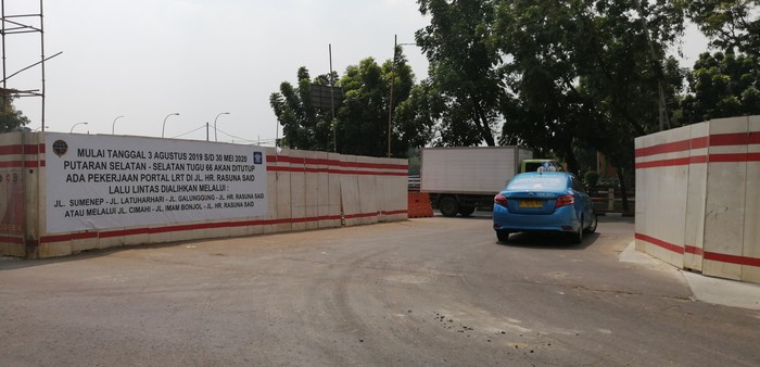 Tampak ada spanduk peringatan yang terpasang di putaran sisi selatan Tugu 66. Spanduk tersebut berisi peringatan soal penutupan dan pengalihan arus lalu lintas bagi kendaraan dari arah Mampang yang hendak berputar lagi ke arah Mampang.