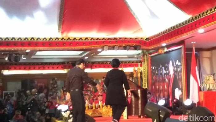 Momen itu berlangsung di arena Kongres V PDIP, Hotel Grand Inna Bali Beach, Sanur, Bali, Kamis (8/8/2019). Mega awalnya berdiri dari kursinya untuk naik ke panggung.