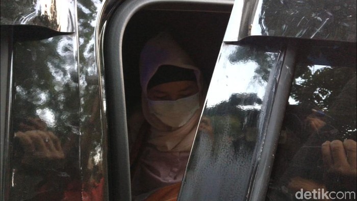 Dia terlihat membawa tas kecil berwarna merah. Mengenakan jilbab berwarna putih, kepala Aulia terlihat ditutupi jaket berwarna hitam saat turun dari mobil.