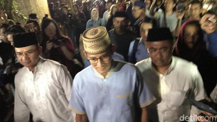 Pantuan detikcom, di rumah duka BJ Habibie, Jalan Patra Kuningan, Jakarta Selatan, Selasa (11/9/2019), Sandi tiba pada pukul 21.53 WIB. Dia tampak mengenakan kemeja berwarna biru dan peci anyaman berwarna cokelat.