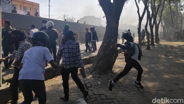 Pantauan di Jl Urip Sumoharjo, Kamis (26/9/2019), polisi menembakkan water cannon dan gas air mata ke arah demonstran. Aksi ini dibalas dengan lemparan batu ke arah gedung DPRD Sulsel.
