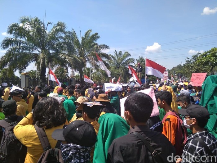 Mahasiswa yang datang dari berbagai perguruan tinggi ini awalnya berkumpul di halaman masjid Islamic Center di Jalan Slamet Riyadi, Samarinda, Kamis (26/9/2019). Lalu mereka long march ke DPRD Kaltim di Jalan Tengku Umar, Karang Paci, Samarinda.