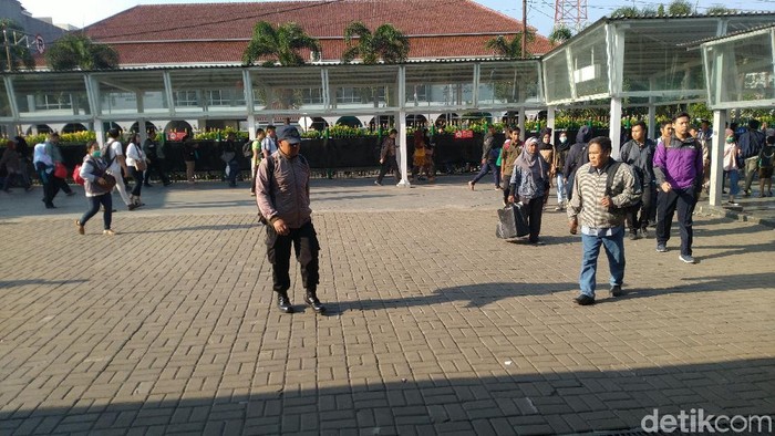 Beberapa polisi terlihat melakukan penjagaan di sekitar stasiun. Petugas keamanan stasiun pun terlihat berjaga di dekat loket.