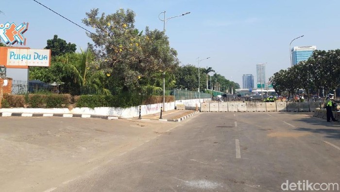 Pengamanan concrete barrier dan kawat berduri itu terpasang di depan Restoran Pulau Dua Senayan. Kendaraan tidak bisa melewati jalan tersebut.