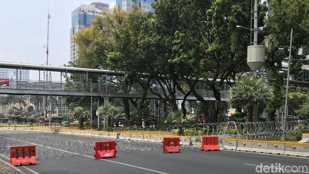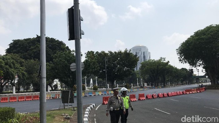 Pantauan detikcom di Taman Pandang Istana, Jalan Medan Merdeka Utara, Jakarta Pusat, tampak personel polisi lalu lintas melakukan penutupan jalan di sekitar Istana Negara pada pukul 09.50 WIB. Penutupan jalan dilakukan menggunakan barrier warna oranye.