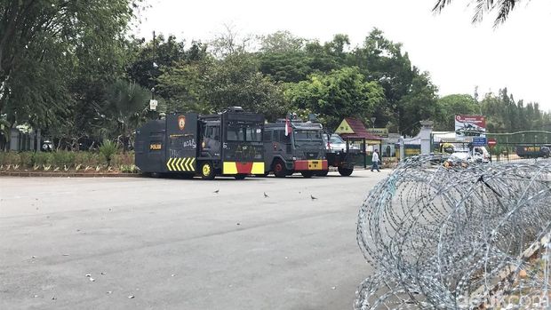 Personel Brimob tampak bersiaga di depan gedung Kementerian Pariwisata dan di sekitar bawah JPO Patung Kuda Arjuna Wiwaha. Water cannon juga telah disiapkan.