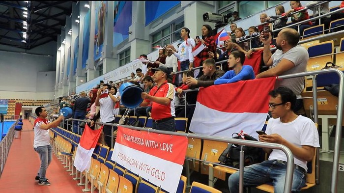 Pendukung Indonesia yang merupakan para mahasiswa Indonesia di Kazan tak henti-hentinya meneriakkan yel-yel dengan menabuh ember-ember, serta mengibarkan bendera Merah Putih. Selain memberikan semangat bagi para atlet, aksi suporter Indonesia yang menabuh ember itu juga menjadi perhatian penonton lainnya yang hadir di arena pertandingan.