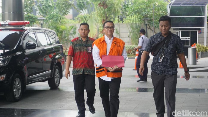 Imam tampak diantar mobil tahanan ke gedung KPK pada pukul 10.00 WIB. Tampak Imam mengenakan rompi tahanan warna oranye dan kedua tangannya diborgol.