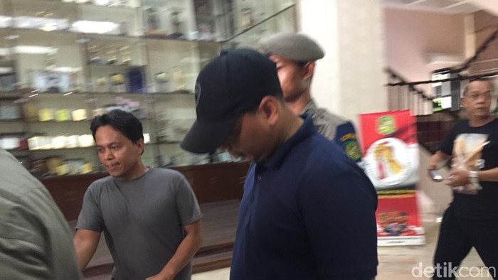 Staf Wali Kota Medan, Andika (kaos biru) menyerahkan diri di kantor Walkot Medan Foto: Khairul Ikhwan Damanik/detikcom