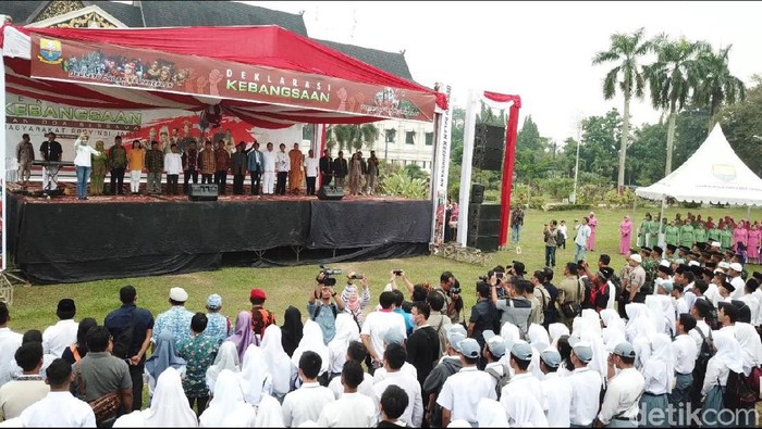 Doa bersama dan deklarasi kebangsaan itu digelar di lapangan hijau kantor Gubernur Jambi di Jalan A Yani, Telanaipura, Kota Jambi, Sabtu (19/10/2019). Sekretaris Daerah Provinsi Jambi, M Dianto, Ketua DPRD Jambi Edi Purwanto, Kapolda Jambi Irjen Mukhlis As, Dandrem 042/Garuda Putih Kolonel Arh Elphis Rudi serta unsur forkompinda lainnya turut hadir.