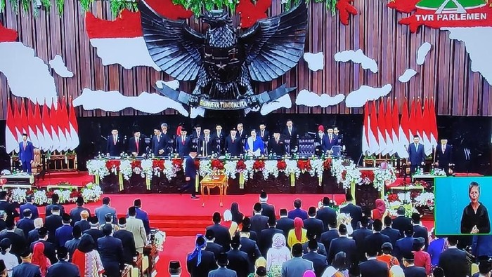 "Kehadiran 689 anggota dari 711 anggota MPR rapat telah memenuhi syarat untuk dibuka," kata Ketua MPR Bambang Soesatyo (Bamsoet) saat membuka sidang paripurna pelantikan Jokowi-Ma'ruf di kompleks MPR/DPR, Senayan, Jakarta, Minggu (20/10/2019).