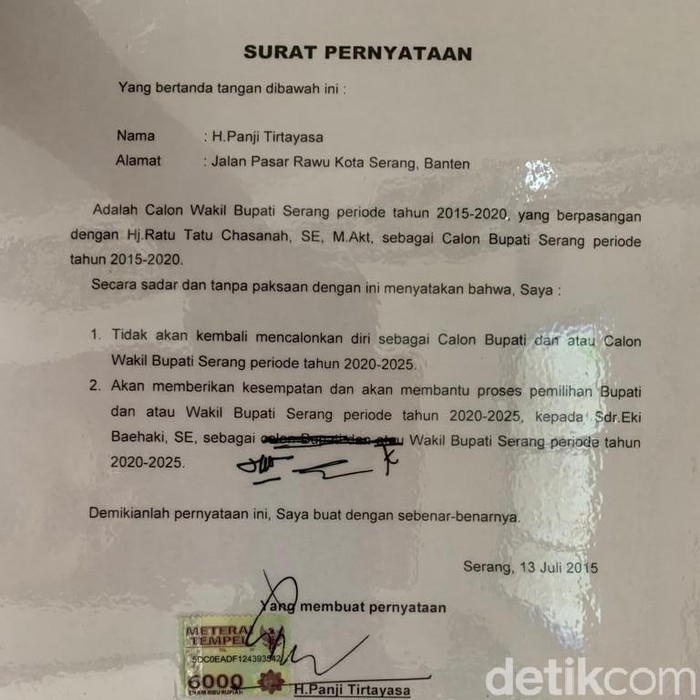 Sebelumnya, beredar surat perjanjian yang ditandatangani Wabup Serang Panji Tirtayasa pada 2015 soal jatah cawagub di Pilkada 2020. Dituliskan bahwa ia tak akan maju sebagai bupati atau wakil bupati. Ia akan mendukung nama Eki Baihaki sebagai calon. Surat perjanjian disaksikan dan ditandatangani oleh Tatu Chasanah dan Iwan K. Hamdan.
