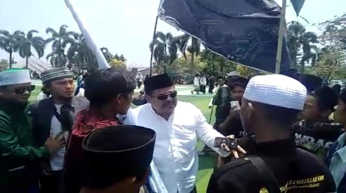 "Bendera ukurannya 7 meter lebih, saya koordinasi izin kepada pihak kepolisian saya kan atas nama panitia. Memohon dengan hormat, hargai acara ini kan hajat NU. Bukan kami tidak cinta kalimat tauhid, warga nahdiyin itu sangat cinta kalimat tauhid bahkan dalam setiap salat 5 waktu, kalimat tauhid itu selalu dibaca," lanjut pria yang juga anggota Ormas Banser tersebut.