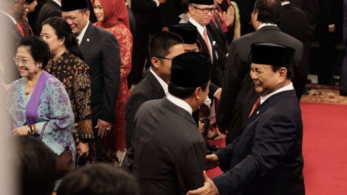 Usai dilantik oleh Jokowi, para pejabat pun langsung bersalaman dan memberi selamat kepada para Wamen itu. Prabowo juga bertemu dan berbincang dengan Wamenhan Trenggono usai pelantikan.