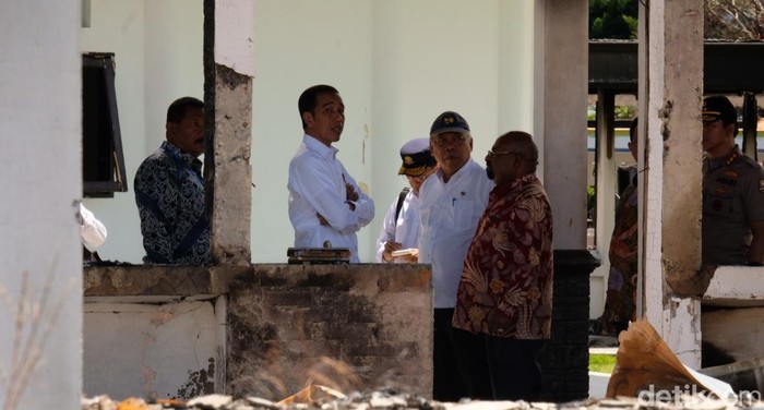 Jokowi tiba di kantor Bupati Jayawijaya, Wamena, Papua, Senin (28/10/2019) pukul 10.20 WIT. Jokowi langsung melihat kondisi bangunan.