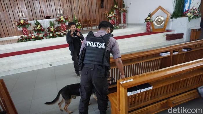 Personel unit K-9 atau anjing pelacak tampak berkeliling di setiap sudut gereja tersebut. Terlihat juga personel yang membawa metal detector.
