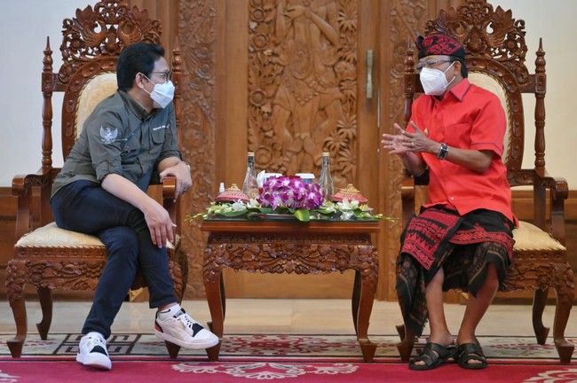 Menteri Desa, Pembangunan Daerah Tertinggal dan Transmigrasi Abdul Halim Iskandar penuhi menemui Gubernur Bali Wayan Koster di Jaya Sabha atau Rumah Dinas di Denpasar, Bali. Abdul Halim diajak melihat film pendek dengan tema penanganan sampah yang memang jadi salah satu persoalan yang dihadapi Pulau Dewata ini.