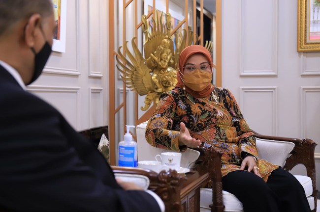 Menteri Ketenagakerjaan Ida Fauziyah memberikan apresiasi pada Dubes RI untuk Qatar, Ridwan Hassan atas kerja kerasnya dalam melayani dan melindungi PMI (Pekerja Migran Indonesia) di Qatar. Hal ini ia sampaikan saat menerima kunjungan kehormatan (courtesy call) Ridwan Hassan di Kantor Kemnaker.