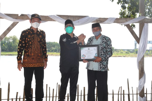 Menteri Desa, Pembangunan Daerah Tertinggal dan Transmigrasi (Mendes PDTT), Abdul Halim Iskandar memberikan piagam penghargaan kepada 170 desa di Kabupaten Lamongan yang telah menyelesaikan pendataan SDGS Desa, Sabtu (5/6).