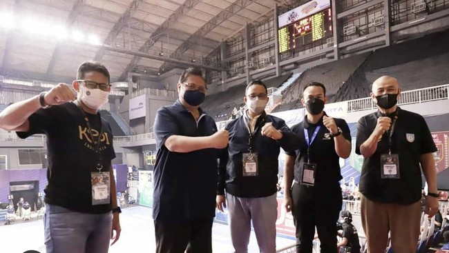 Menteri Koordinator Perekonomian Airlangga Hartarto bertemu dengan Menteri Pariwisata dan Ekonomi Kreatif Sandiaga Uno serta Gubernur DKI Jakarta Anies Baswedan. Ketiganya bertemu di gelanggang basket.