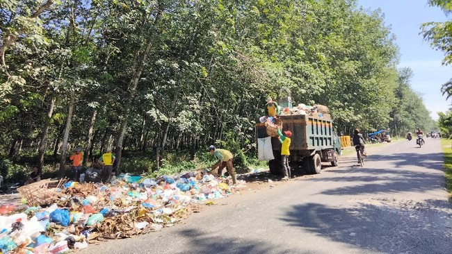 Pantauan detikcom di lokasi, Selasa (8/6/2021), tampak lima petugas kebersihan sedang bekerja mengangkut tumpukan sampah yang mengular hingga puluhan meter.