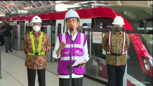 "Tetapi saya tadi sudah mencoba LRT yang ini 100 persen dikerjakan oleh PT INKA, yang nanti akan dioperasikan oleh PT KAI. Semuanya dikerjakan di Indonesia, termasuk juga pembangunan konstruksinya oleh PT Adhi Karya," tutur Jokowi.