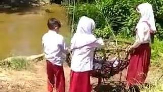 Sebuah video beredar di media sosial menggambarkan anak SD bergelantungan menyeberangi sungai untuk bersekolah. Mereka memakai 'kereta gantung' menantang bahaya berjuang untuk bisa sekolah.