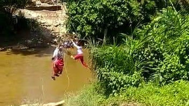 Sebelumnya, ramai video viral aksi tiga murid SD bergelantungan pada 'keranjang terbang' untuk menyeberangi sungai bak bermain flying fox.